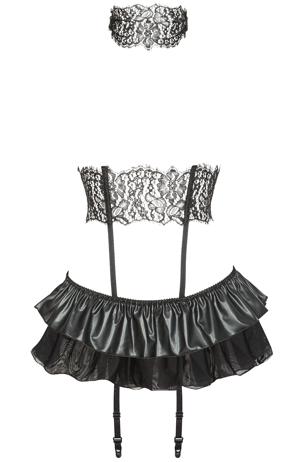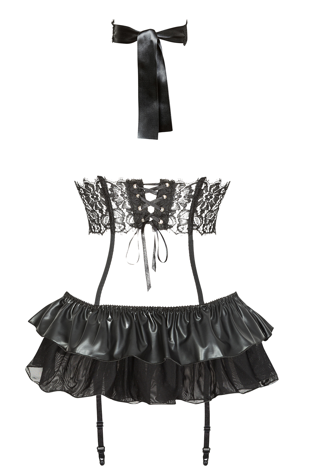 Extremely sexy but also exclusive set consisting of three parts. The skirt is made from elastic shiny material and tulle and is also a garter belt. It is joined by vertical straps with short corset made from beautiful lace. The corset is laced at the back with black satin ribbon. The same lace pattern appears on the Mask. Thong is included. (the stocking are not included but are available separately, please see related products). Beauty Night gift boxes are a gift in themselves! Made from premium materials, they are laser-spot printed with an front and back image of the garment, and carry the Beauty Night logo both as a raised image and a hologram. This is a mark of quality and authenticity. The box also carries sizing and fabric information These boxes are very pretty, and are also useful for storage. There is an organza bag to keep the garment in or use as a laundry bag. Within the outer sleeve, there is a lovely embossed presentation box with the Beauty Night logo in beautiful gloss white.