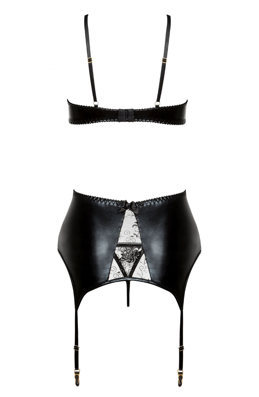 An extremely sexy and at the same time sensual three-piece set. Made of flexible lacquered soft material and beautiful lace. The set consists of an open bra and a deep garter belt and sexy thong . Adjustable shoulder stapes garter straps and hook and eye fastener on the bra top. (stockings not included) Set in the elegant packaging with the picture presenting the product marked with the hologram from the logo Beauty Night Fashion. Bag-pouch for storage or laundry included