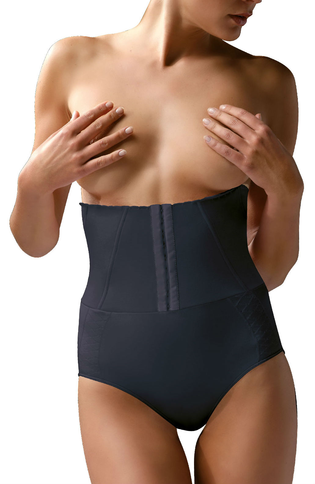 Corset shaping brief with hook and eye fastenings. High compression providing a firm level of support. Jacquard panelled and scalloped edge. Shapes the waist lifts the bottom smooth the tummy and supports the back. Anti-bacterial gusset. Item comes packaged in a Control Body box.